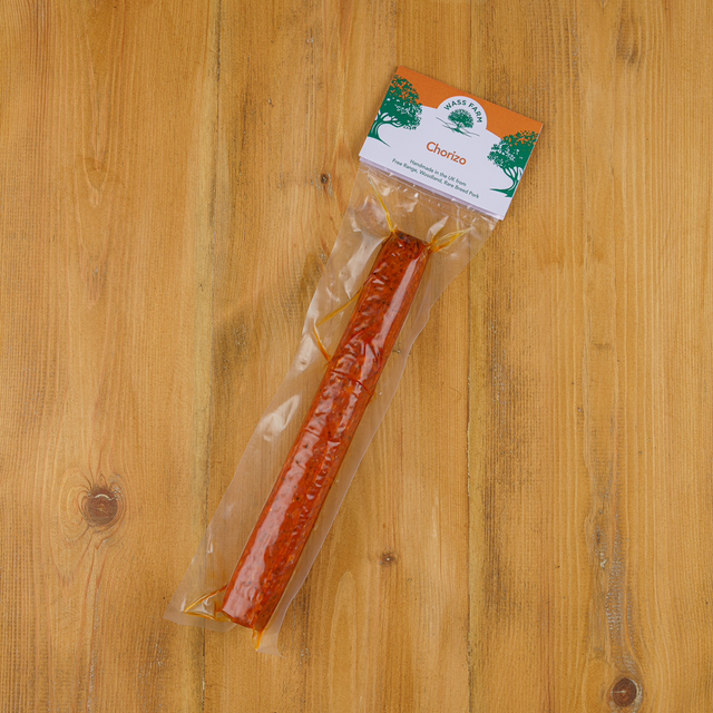Free range, Woodland, rarebreed pork chorizo. Ingredients: Free range pork 89.41%, salt, hot smoked paprika, garlic, black pepper, dextrose, oregano, Cayenne pepper, preservative (sodium nitrite) Gluten, wheat and lactose free.