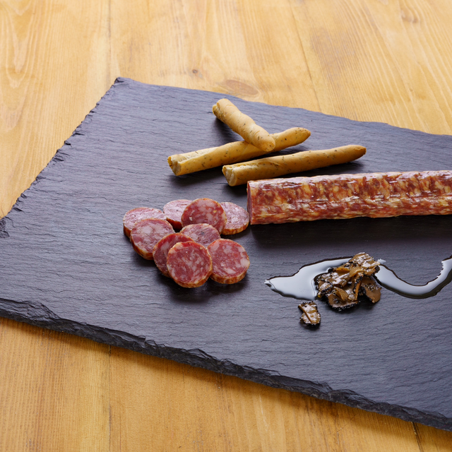 Rarebreed, Free Range, Woodland Pork Salami with a touch of truffle. Perfect for truffle lovers. 180g Ingredients: Free Range pork 96.2%, salt, black pepper, dextrose, truffle oil, preservative (sodium nitrite). GLUTEN, WHEAT AND LACTOSE FREE